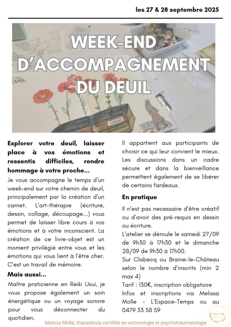 Weekend d'accompagnement du deuil : Il s'agit d'un accompagnement de 2 journées au cours desquelles nous explorerons votre deuil grâce à l'art-thérapie, en travaillant, entre autres, vos deuils collatéraux, votre ancrage, vos émotions pour découvrir vos richesses et ressources.