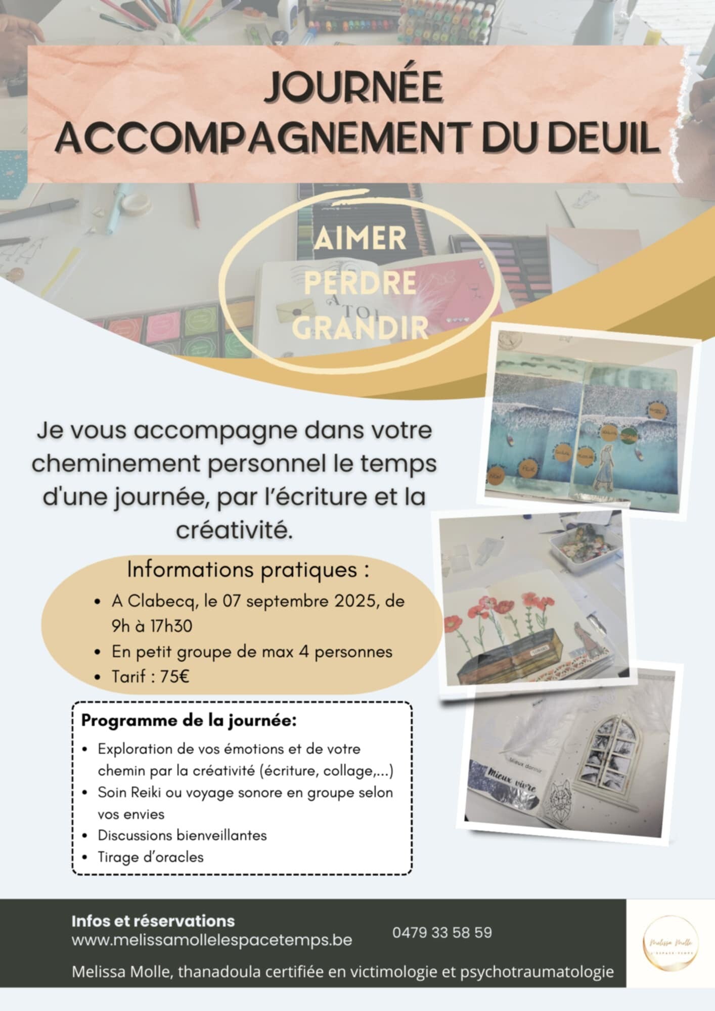 Accompagnement du deuil (journée) : il s'agit d'une journée d'accompagnement du deuil, par la création d'un carnet autour du thème "Aimer, perdre, grandir" et par l'énergétique (soin reiki en groupe ou voyage sonore, oracles) au cours de laquelle vous échangerez librement sur vos ressentis, le chemin parcouru, les émotions traversées,...